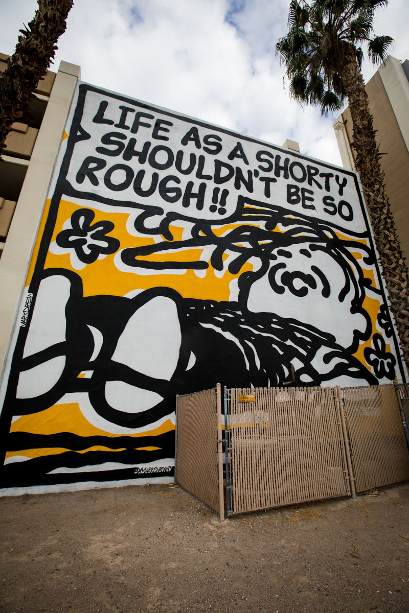 Nostalgic and cheeky, Mural by Mark Drew combines two beloved classics: Peanuts and Wu-Tang Clan. Linus of the Peanuts gang lies back with a bubble above him saying “Life as a shorty shouldn’t be so rough!!” This bold and bright art installation sits on Fremont Street between 6th and 7th. An ironic favorite, it’s perfect for couples looking for something whimsical and totally unexpected.