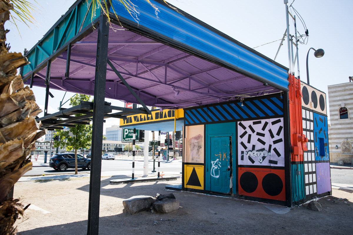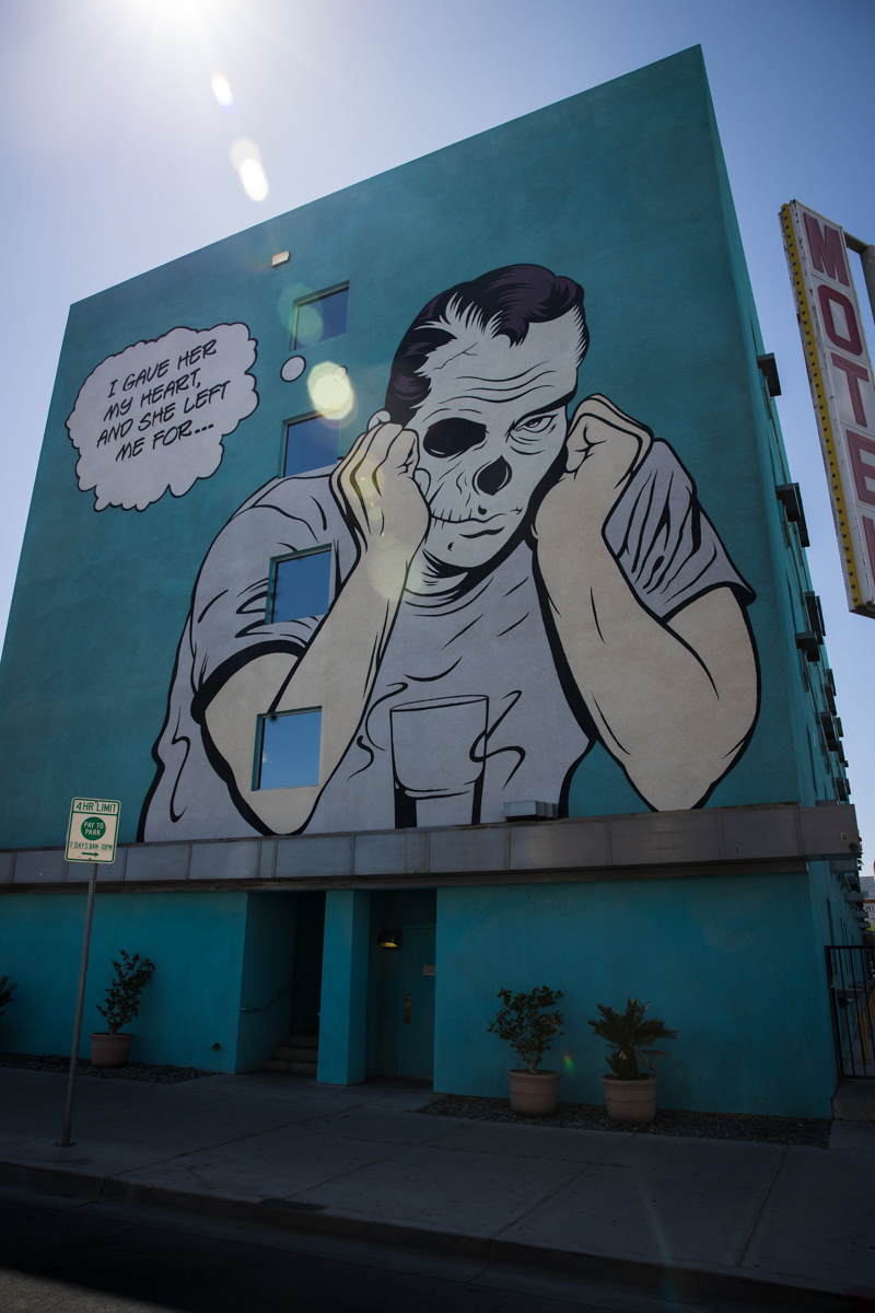 At 7th Street and Ogden Avenue sits an installation created for the Life is Beautiful Festival by artist D*Face.