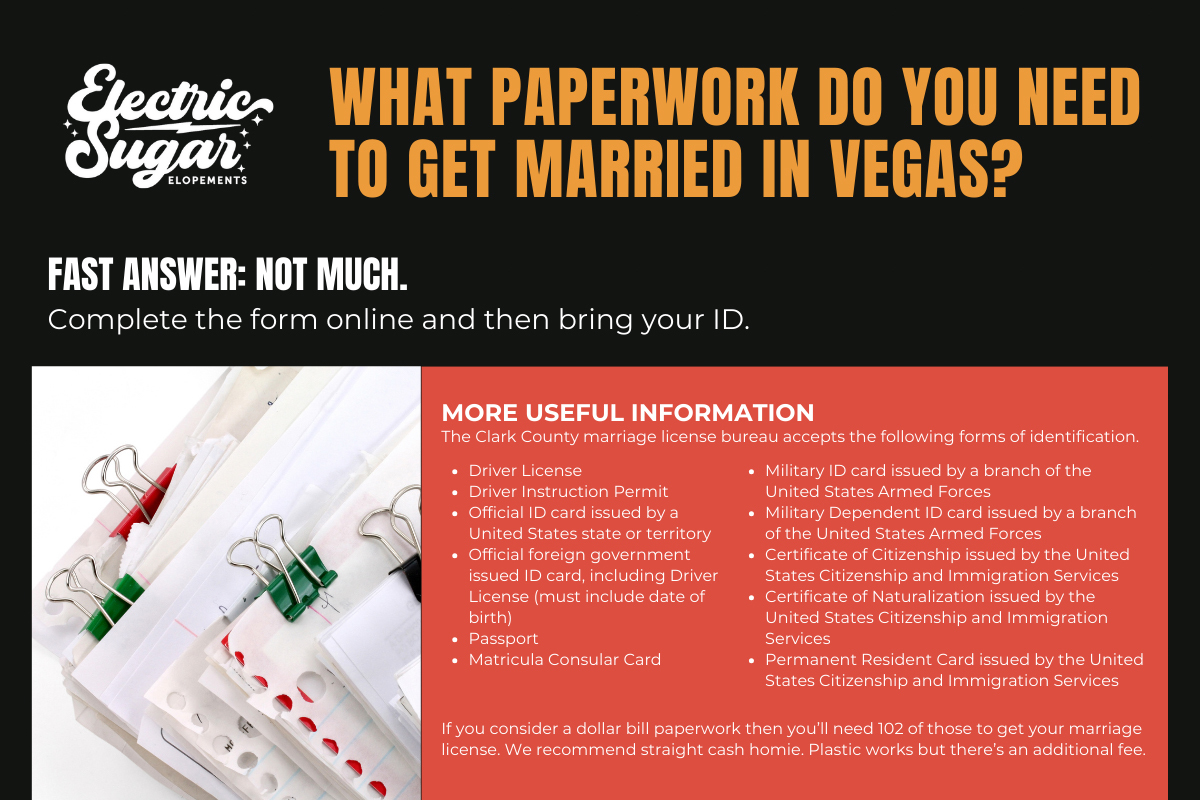 If you consider a dollar bill paperwork then you’ll need 102 of those to get your marriage license. We recommend straight cash homie. Plastic works but there’s an additional fee.