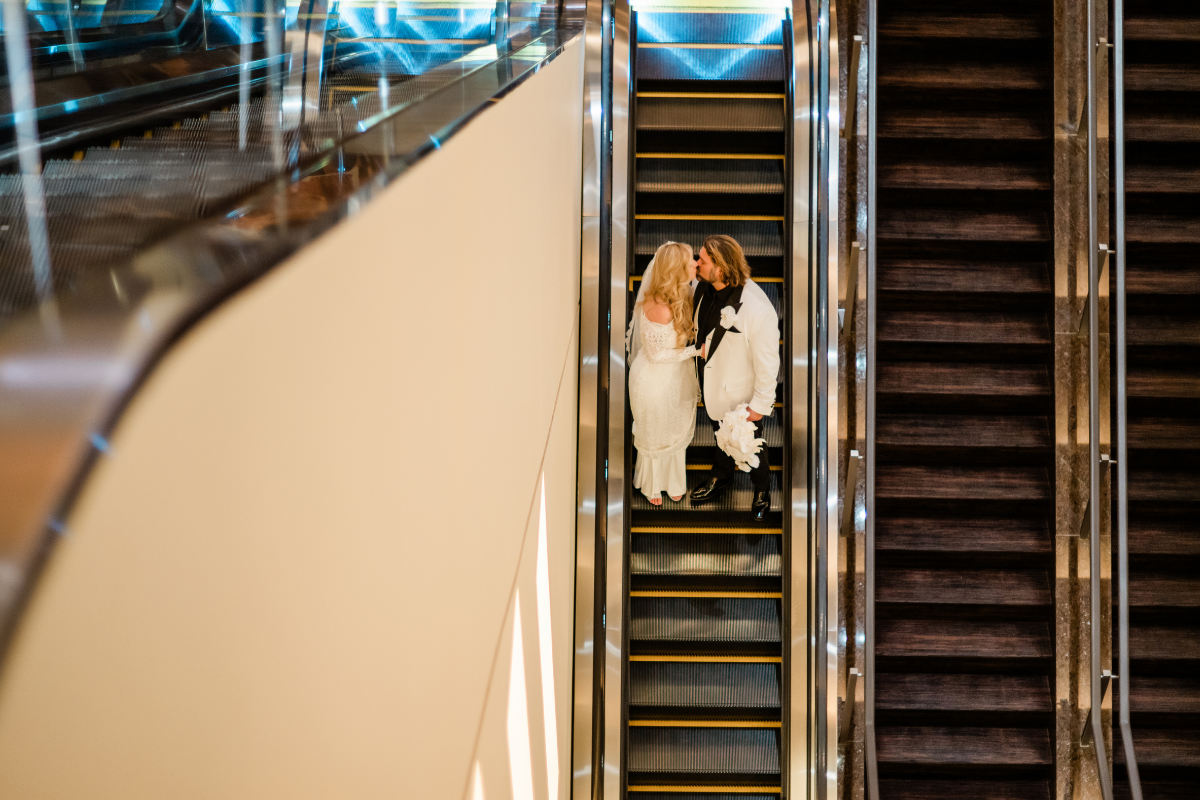 No playground in sight? What about an escalator, a glass elevator or even a staircase? I like to send my nervous couples on this short ride (or walk) and tell them to turn around and wave when they get to the end. If they aren’t laughing at the silliness of this request, then at least I’ll be able to get a couple interesting angular shots of them with interesting lines provided by the glass, stainless steel and reflections or other architecture elements.