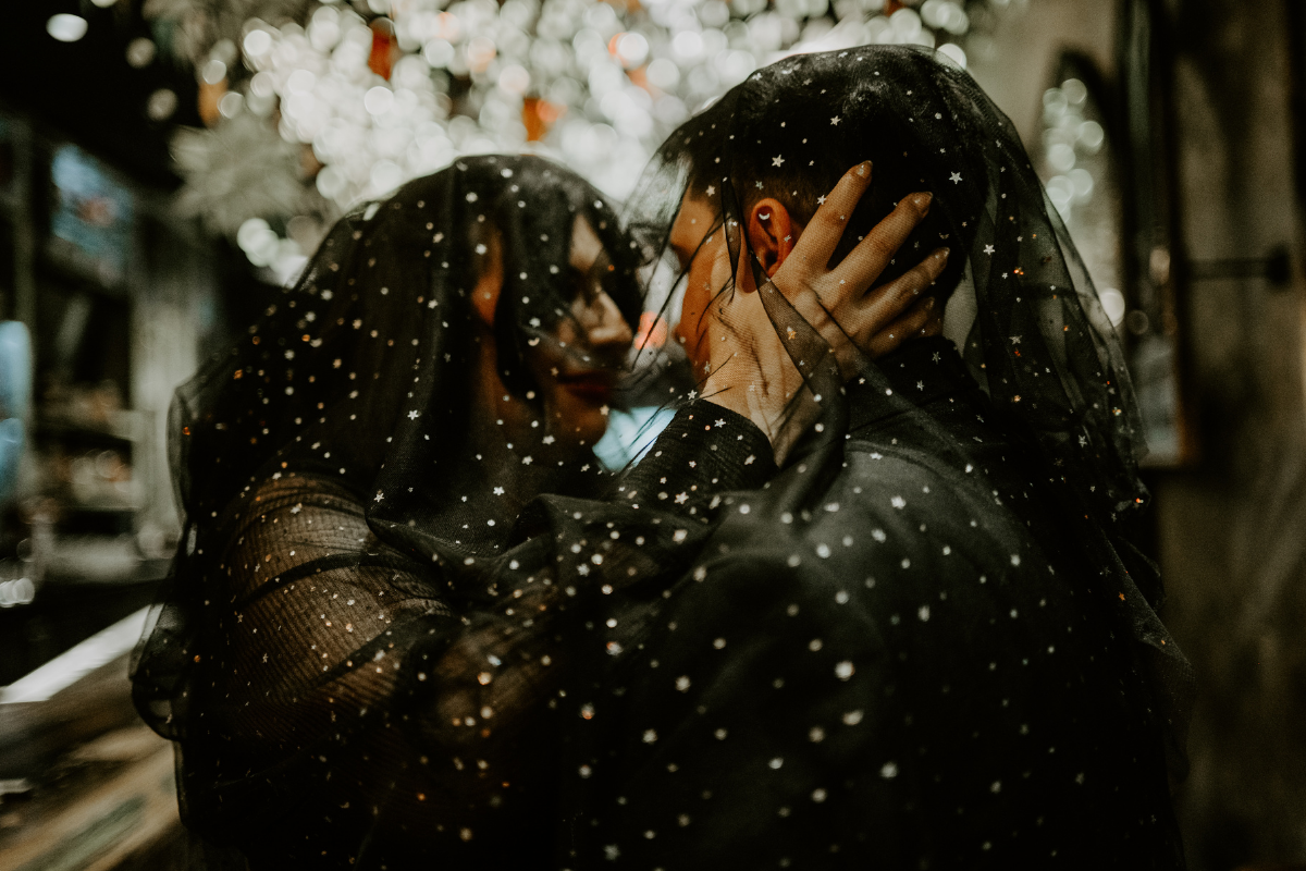 If you’re still wishing you could crawl in a hole and die, use your attire to your advantage by going for the classic “couple under the wedding veil” shot. Hide under the veil, so the photographer can get those intimate moments and cheeky looks that we all love to see in a wedding album.
